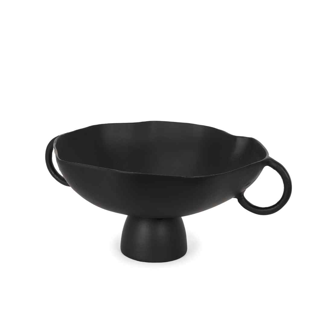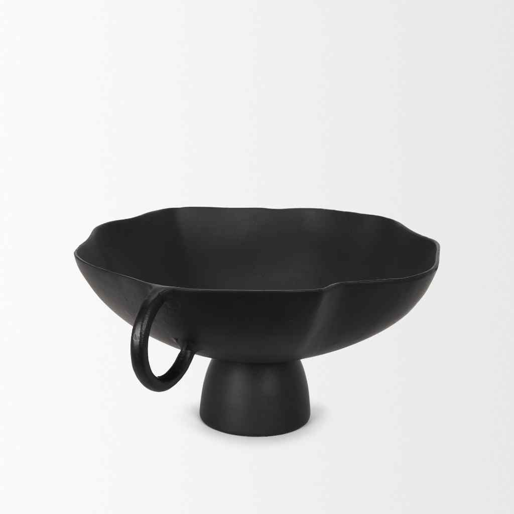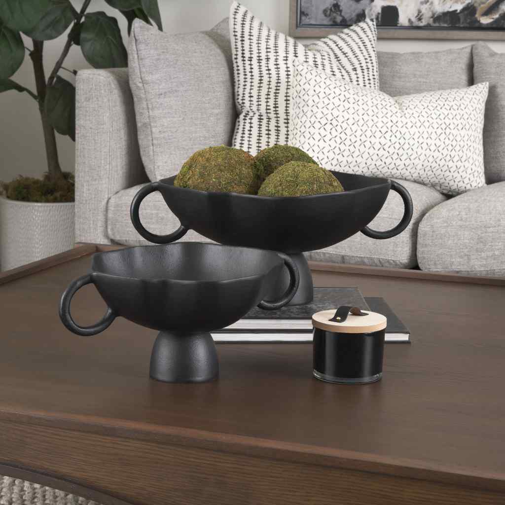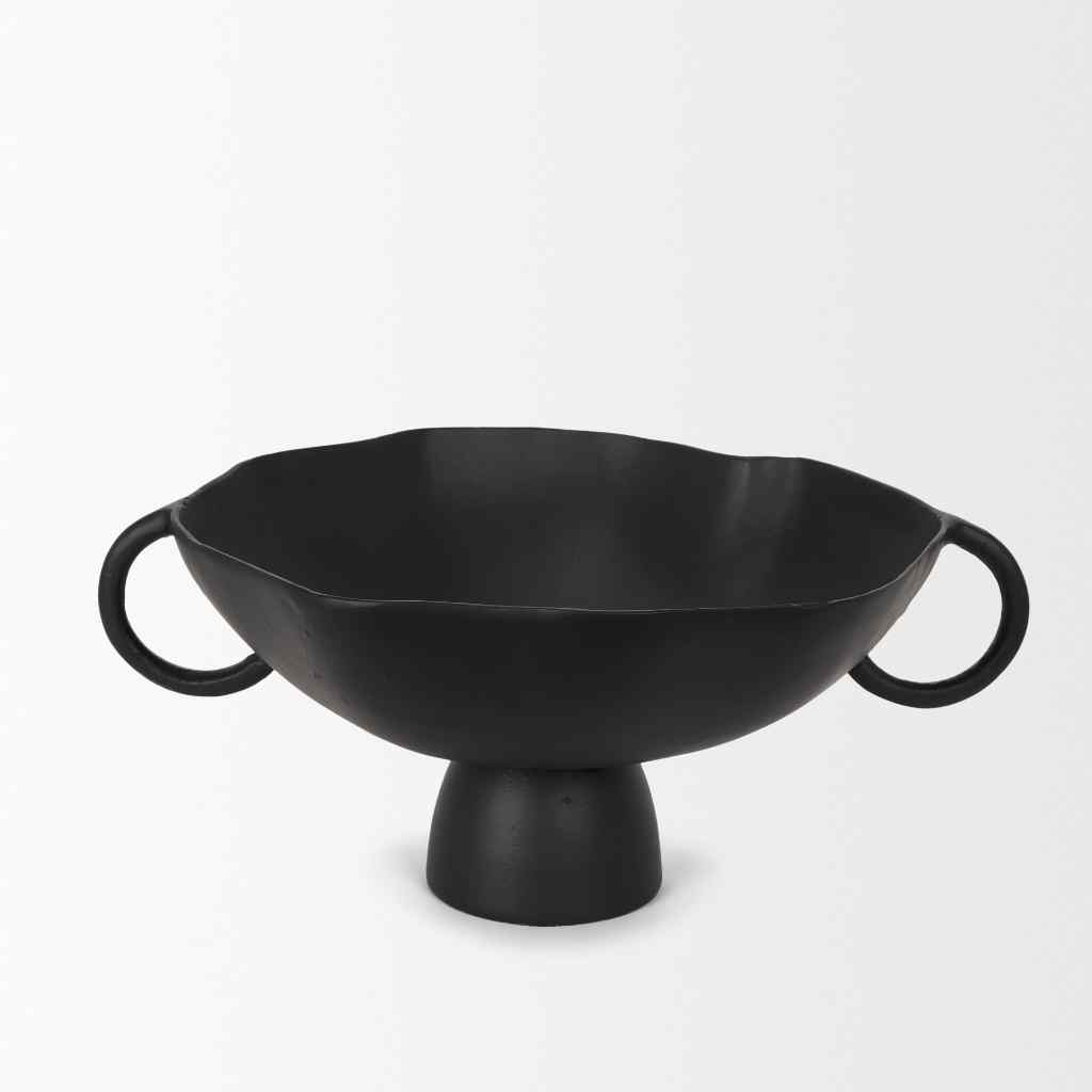 The Radka Decorative Bowl is expertly crafted from cast aluminum, showcasing organic lines and two handles, all accentuated by a powder coated matte black finish.