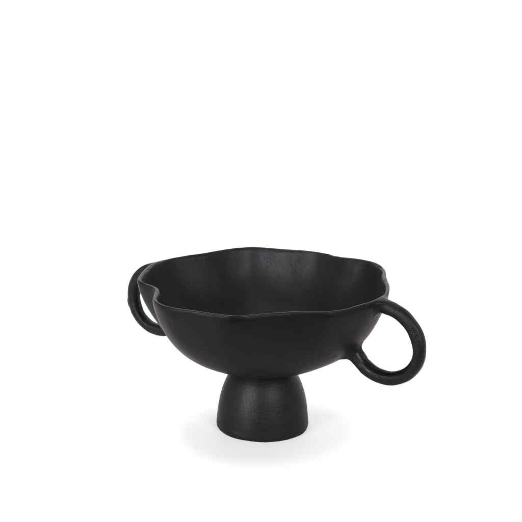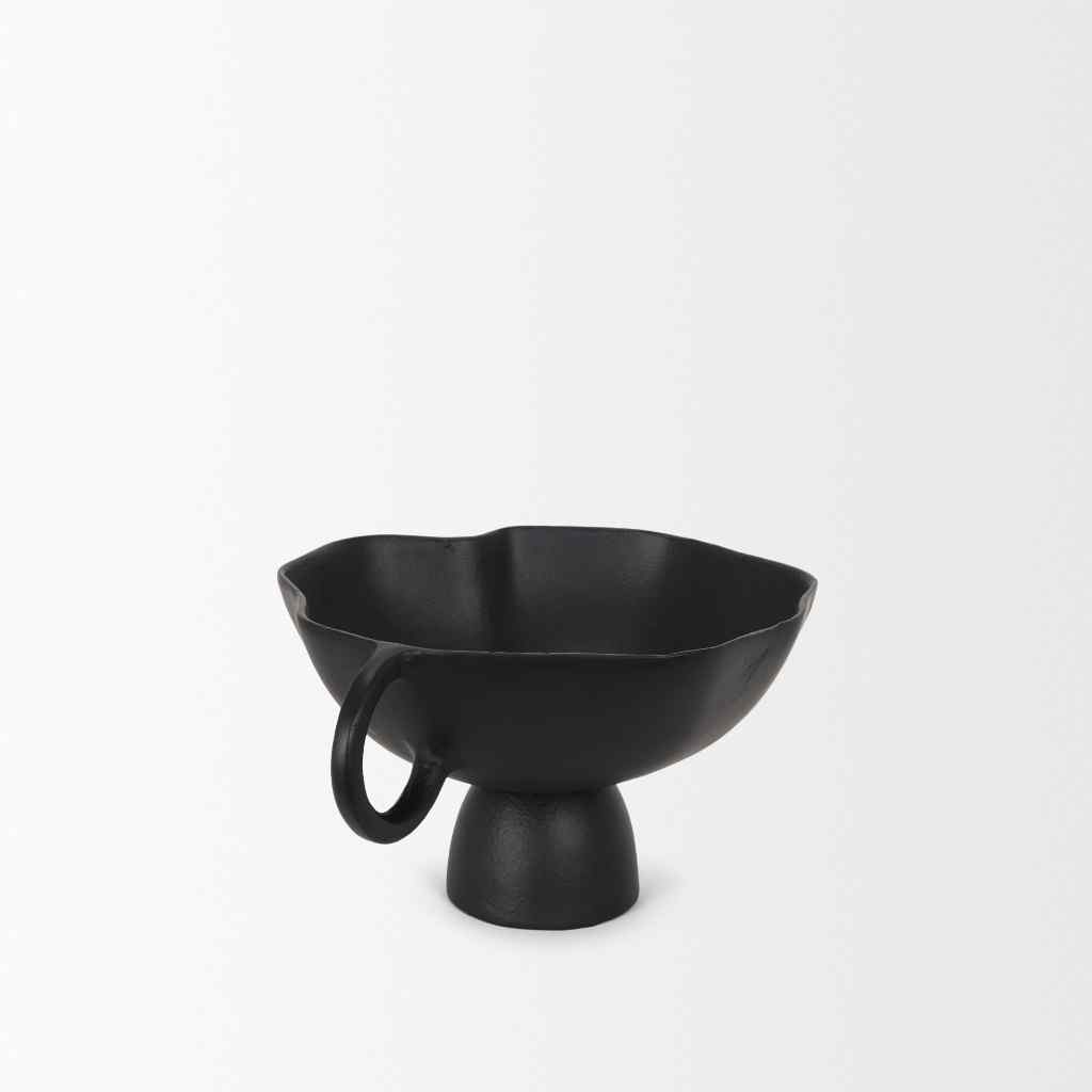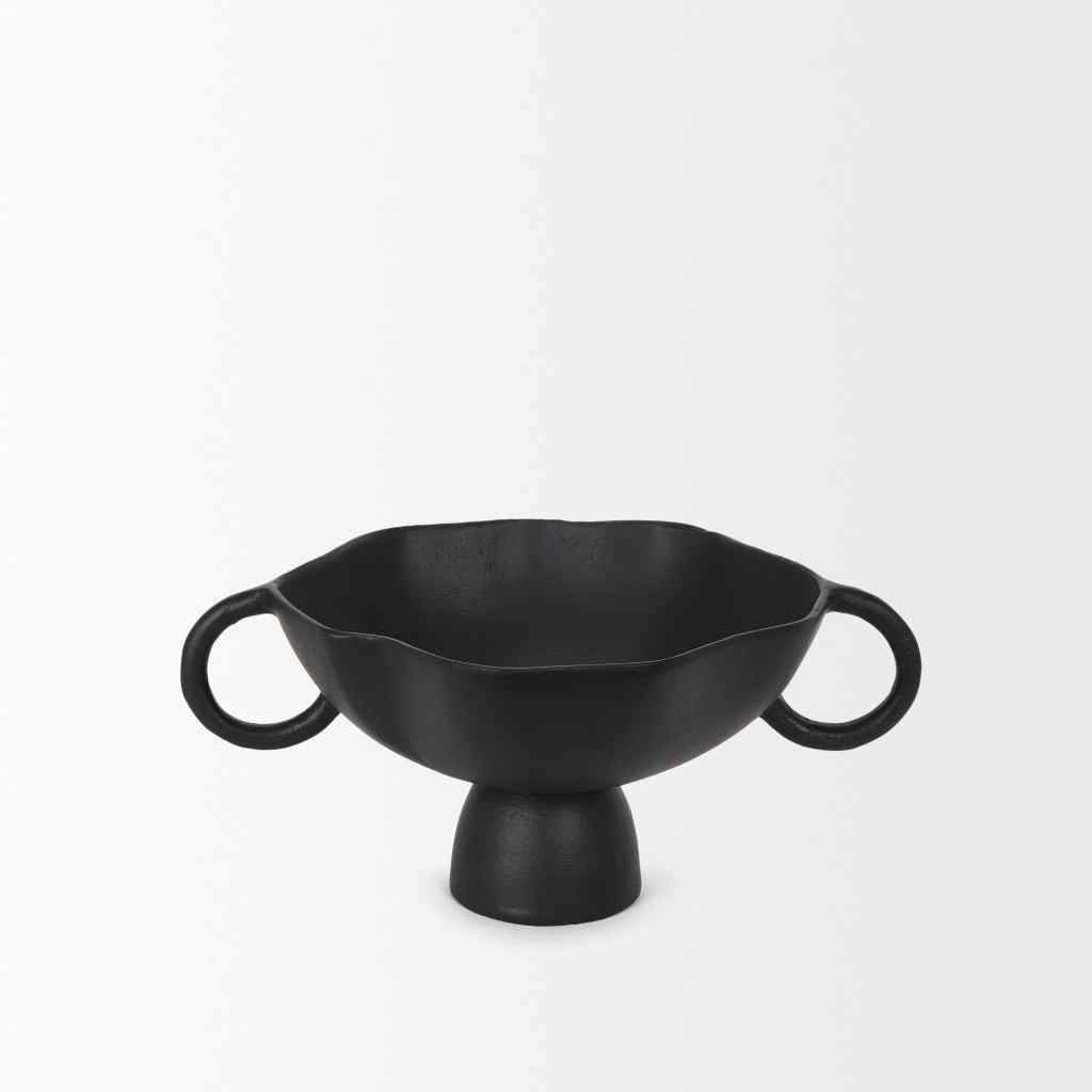The Radka Decorative Bowl is expertly crafted from cast aluminum, showcasing organic lines and two handles, all accentuated by a powder coated matte black finish.