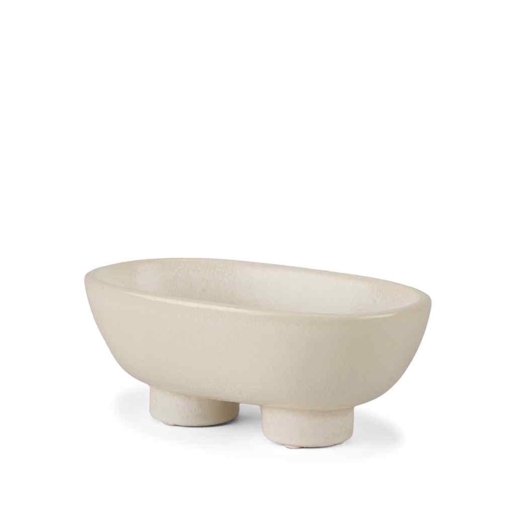Tyren is an elegant decorative oblong cream bowl featuring a glazed finish and a pedestal-footed base.