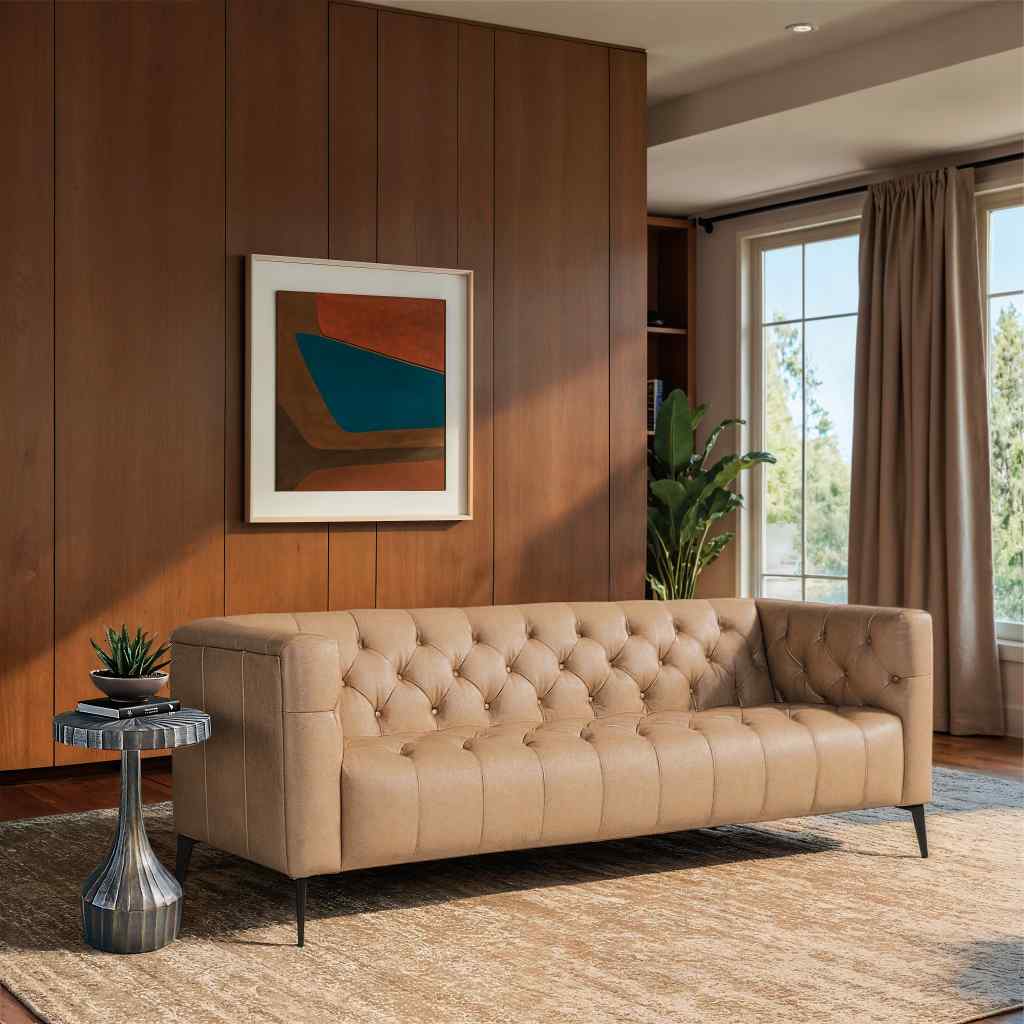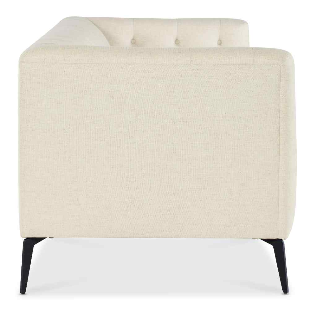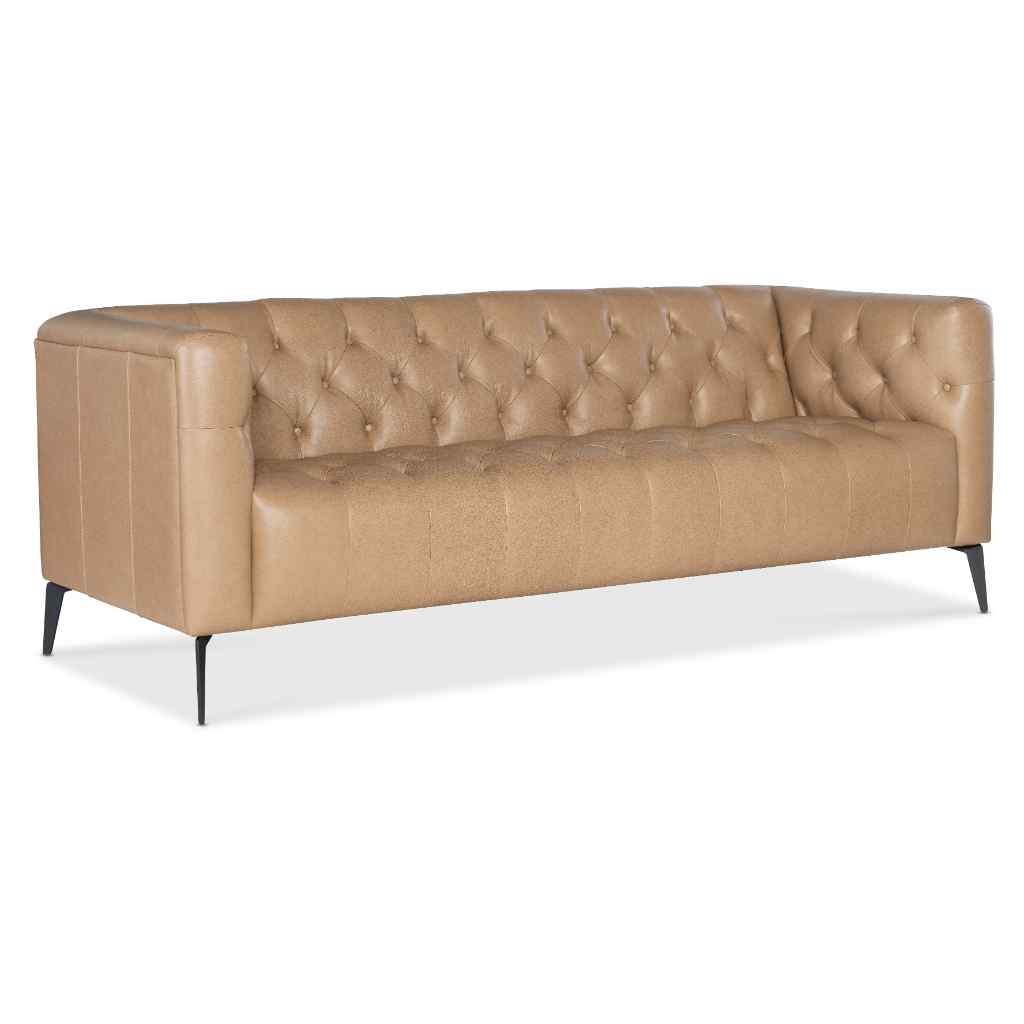 The Nicolla Stationary Sofa, upholstered in Texas Stone Semi-Aniline Top Grain leather, brings together traditional elegance and modern design. With its button tufted interior and chesterfield-inspired shelter arm design, the sofa rests on tall matte black metal tapered legs, giving it a light and airy aesthetic. This sofa is the perfect addition to any stylish living room.