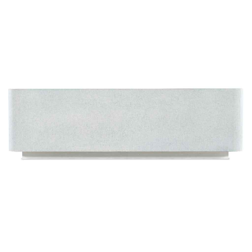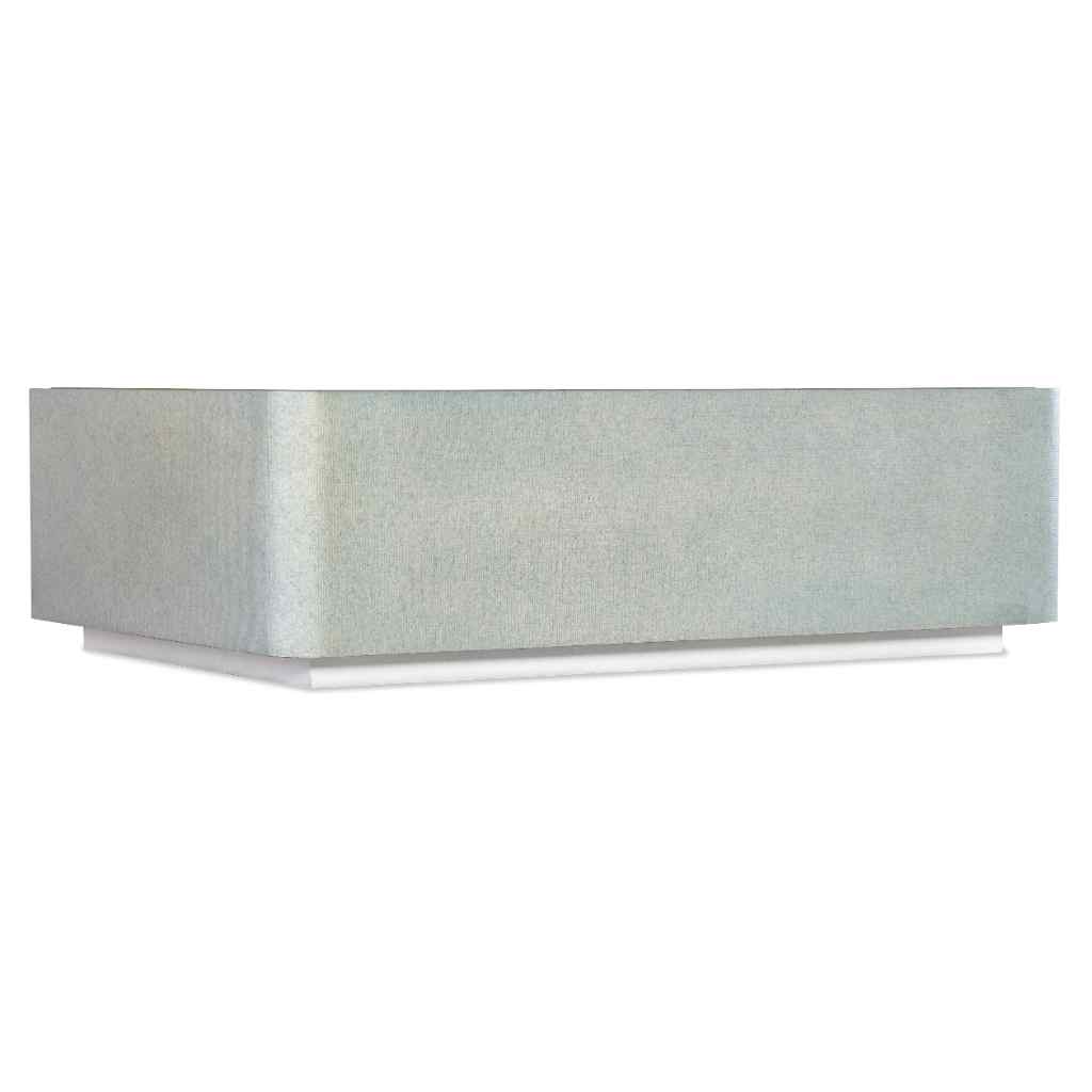 Serene and stylish with a spa-like color scheme, the modern Atlantis Cocktail Table has a large rectangle shape, rounded corners, a painted tempered glass top, raffia-wrapped exterior and white plinth base. The top is painted in a creamy white tone, and the raffia wrap is in a pale blue tone inspired by Caribbean beaches.