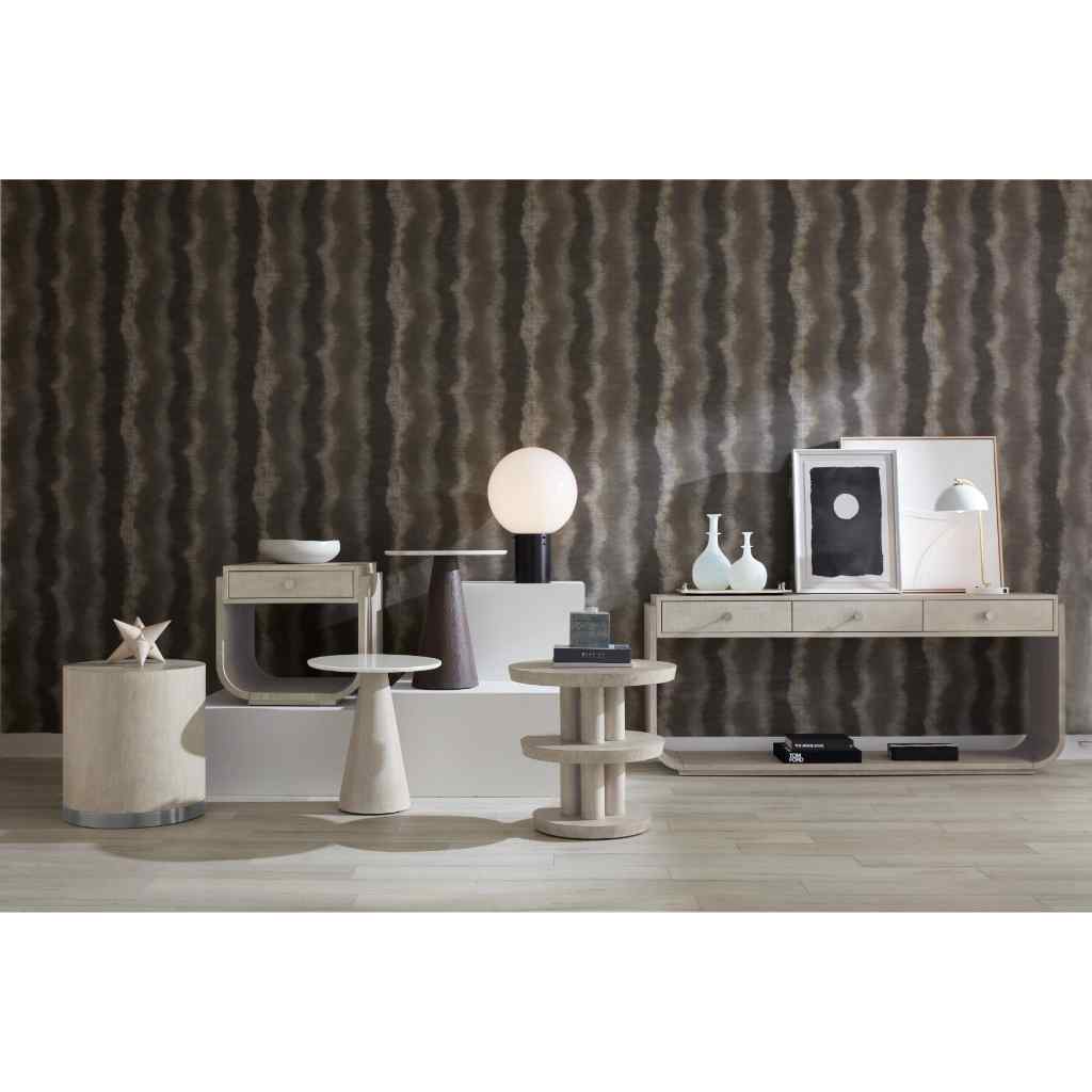 Architectural and timeless with a luxe mixture of materials, the striking Modern Mood Rectangle End Table is crafted of Quartered Oak Veneers with a raffia-wrapped drawer front and top. Featuring rounded sides, the table is finished in Diamond, featuring wire-brush detailing with crystal-like alabaster and pewter hues.